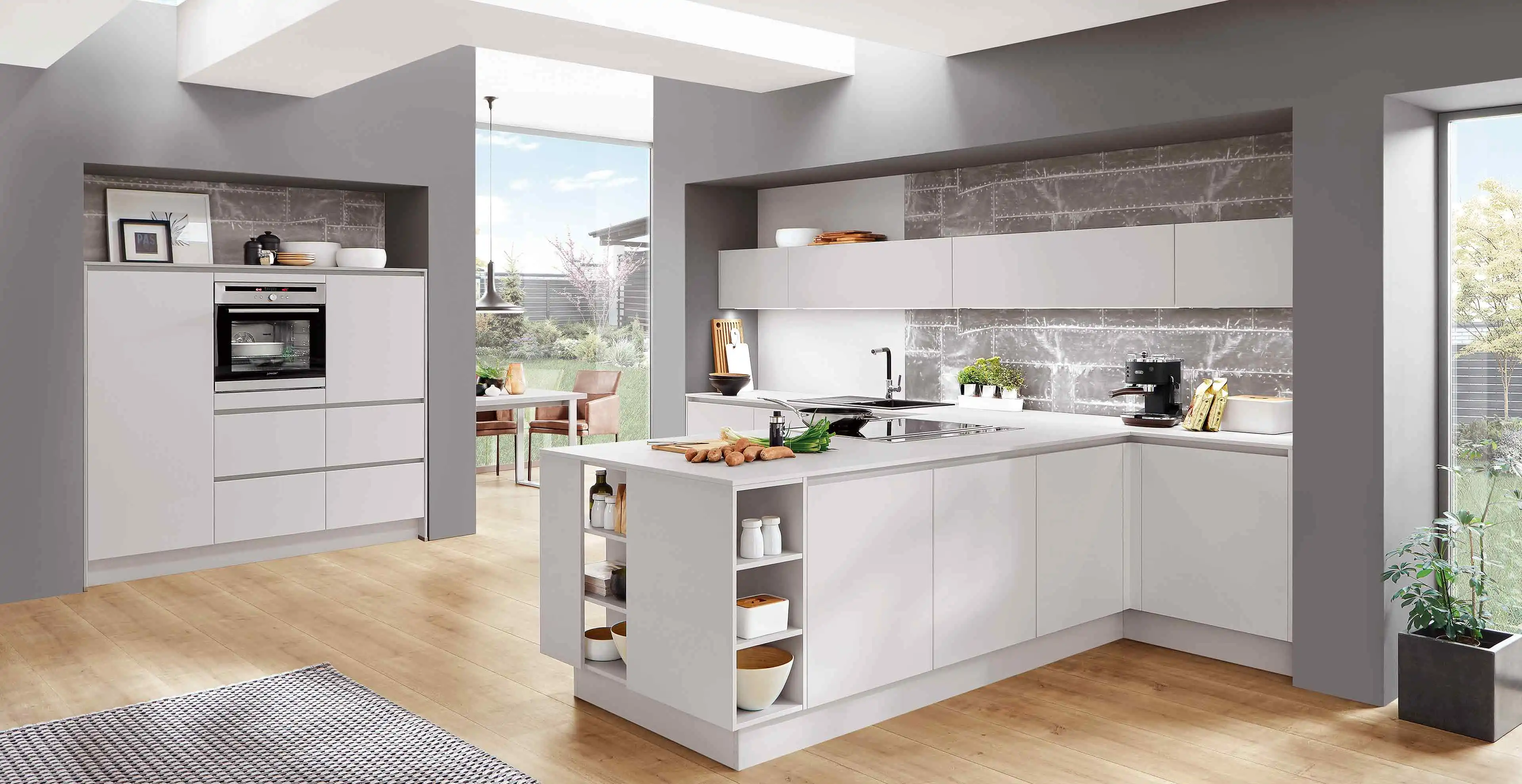 Diese Küche steht für ihre helle und matte Front, welche optisch für ein offenes Raumbild sorgt. Die grifflosen Fronten, mit der hellen Quarzsteinplatte Zenith, wirken durch ihr einfarbiges Muster zeitlos und harmonisch.