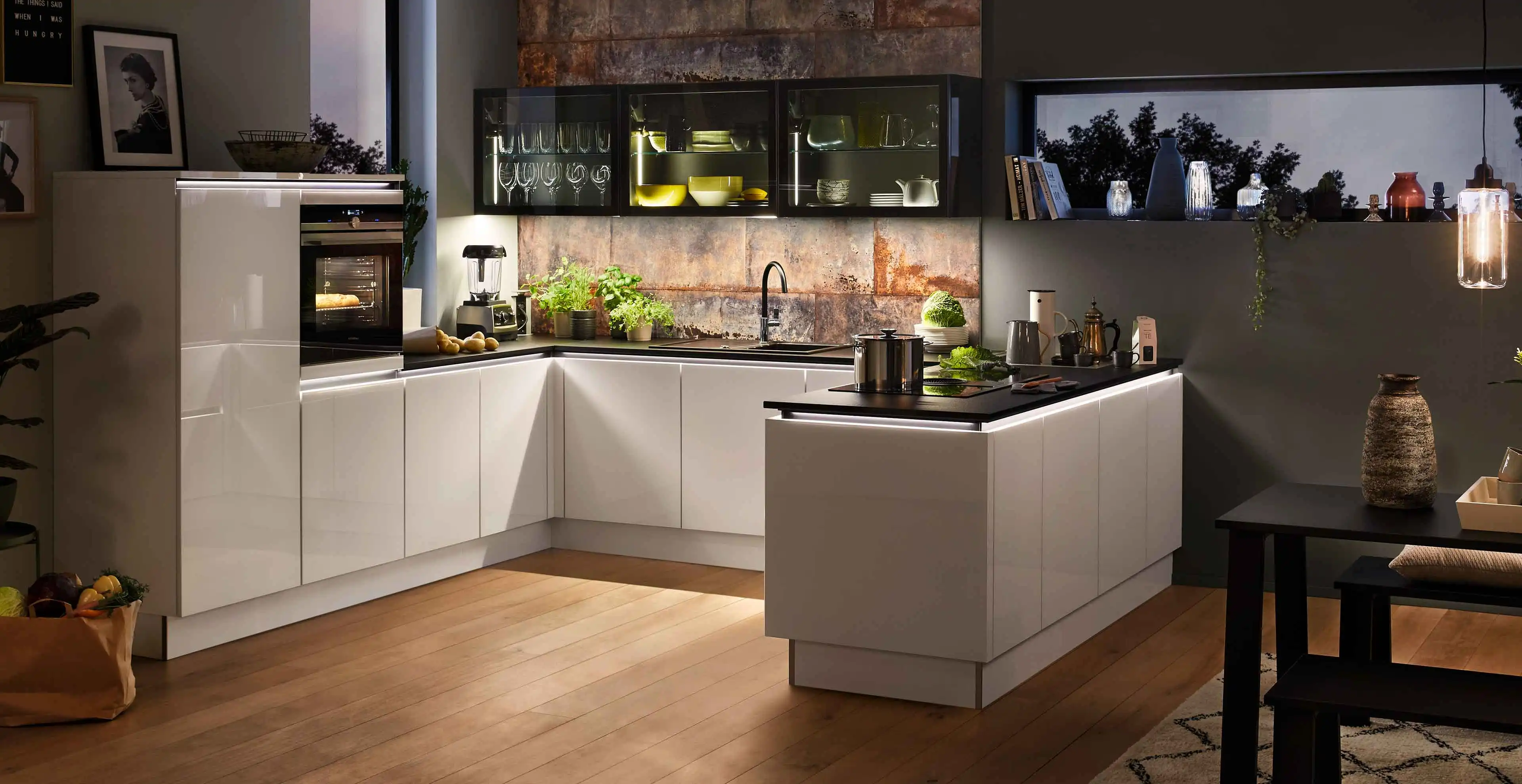 Diese Küche in U-Form glänzt durch ihr modernes Design und vor allem durch die hochwertigen Echtglasfronten.