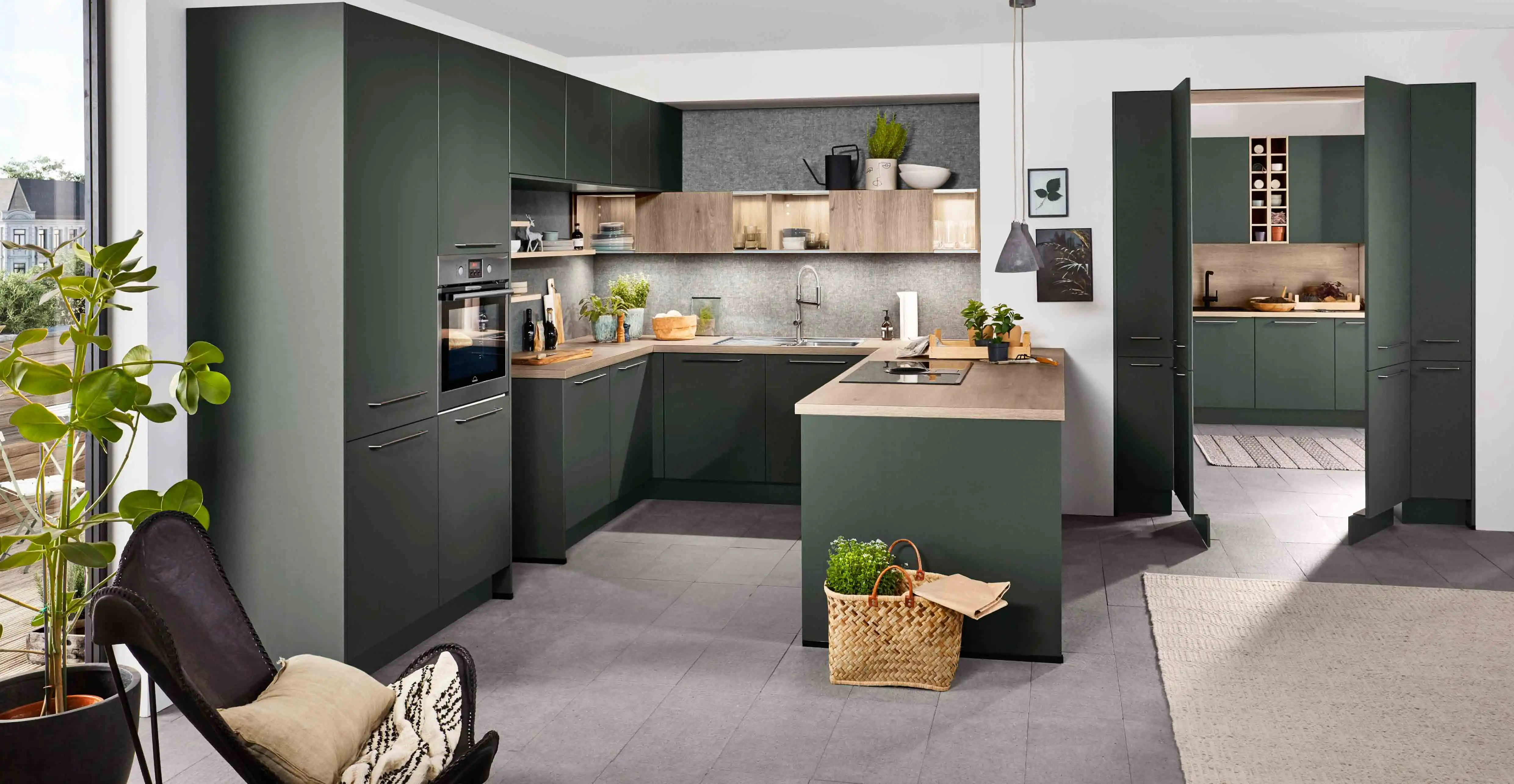 Mit dieser Küche schaffst du dir deine grüne Oase zum Wohlfühlen und Kochen. Kombiniert mit Elementen und natürlichen Akzenten wie der Holznachbildung sorgt die grüne Farbe der Fronten für Ruhe und Ausgeglichenheit.