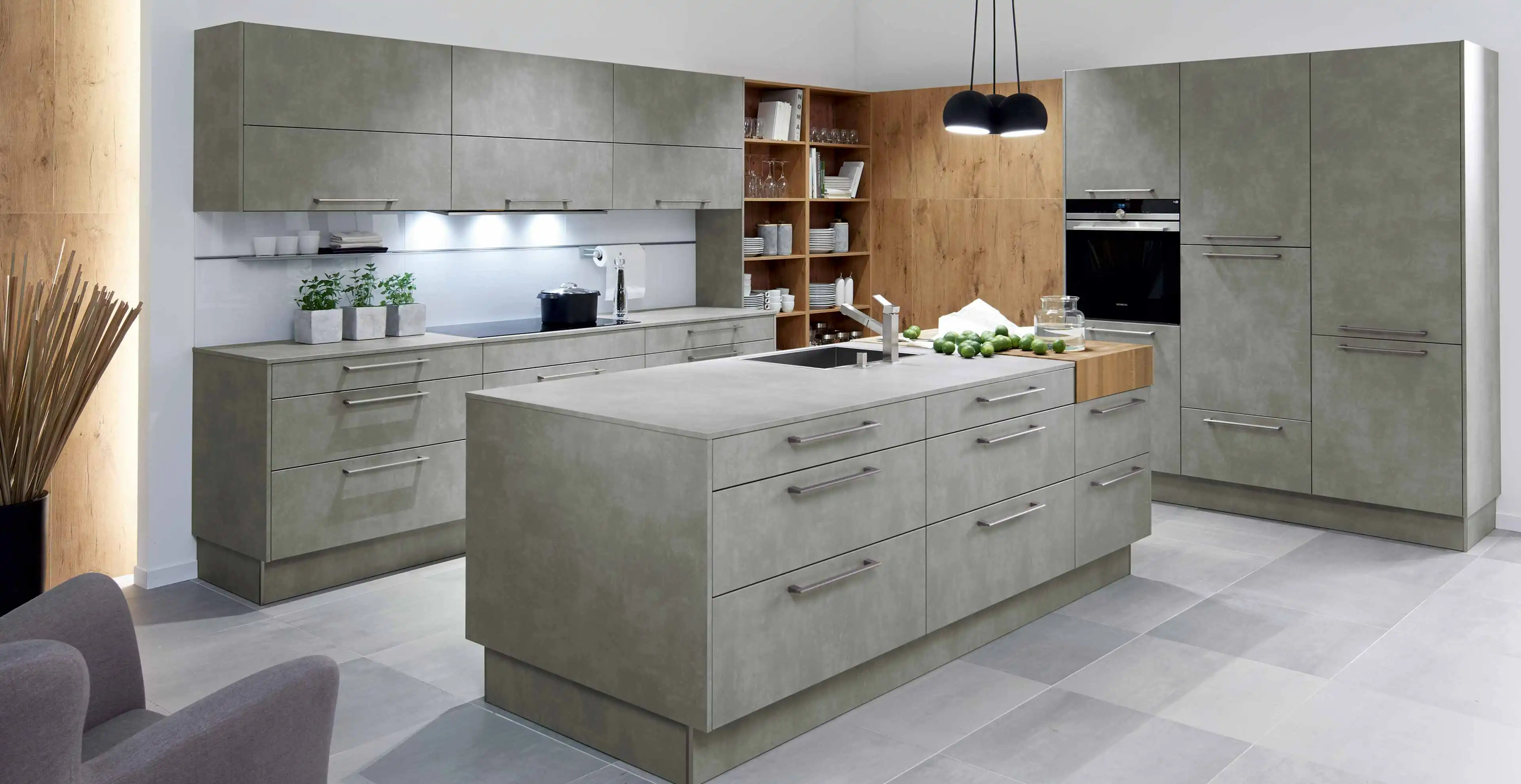 Diese Inselküche mit einfarbigen Zementmuster wirkt zeitlos-harmonisch und bietet viel Platz zum Kochen. Das Besondere an dieser klassischen Küche sind die hellen Fronten in matter Zementoptik und die hellgraue Arbeitsplatte Gris Molino.