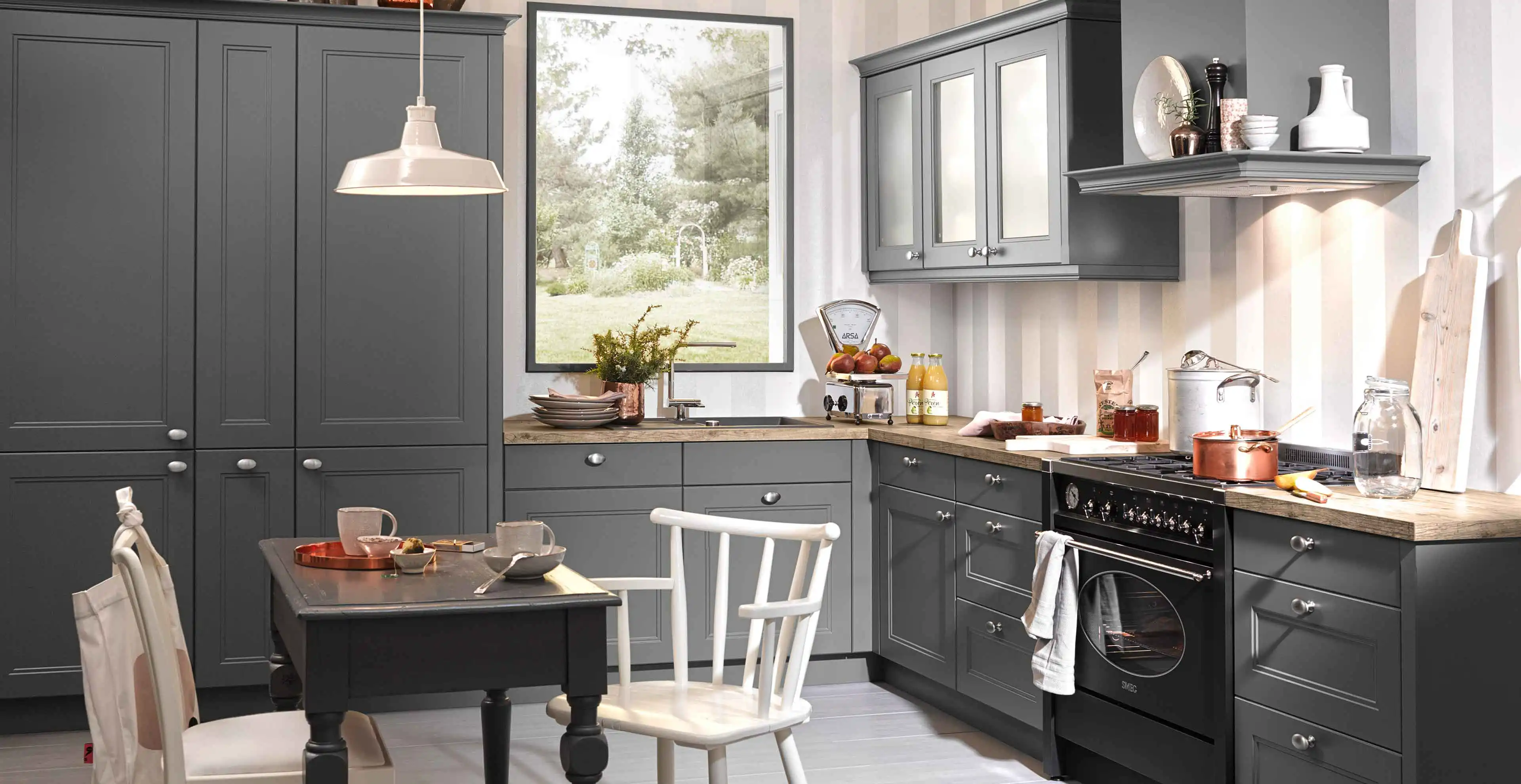 Diese Landhausküche überzeugt durch Ausstattung und Ausstrahlung. Aufbewahrungswunder wie ein Topfkarussell werden mit Designelementen wie Kranzleisten vereint. Mit der beliebten L-Form können sowohl kleinere Räume, als auch Wohnküchen perfekt ausgestattet werden. Besonderheit dieser Küche im Landhausstil ist ein Gasherd natürlich können Sie bei uns auch auf andere Technologien setzen.